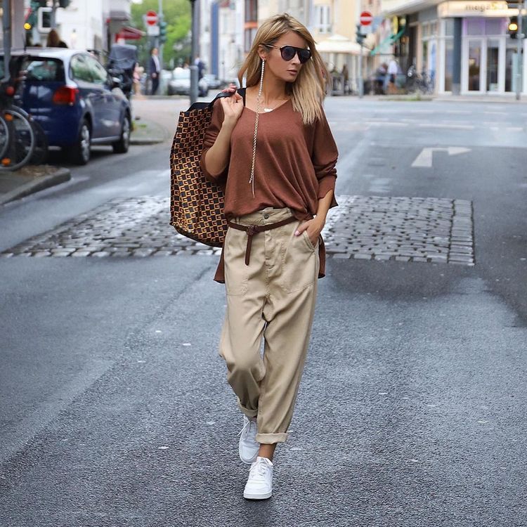 - Calças bege – São um clássico que coordenadas com uma t-shirt branca ou com uma camisa, estará sempre bem vestida. Num estilo mais prático, pode calçar ténis ou sandálias rasas; caso queira dar um ar ao coordenado mais clássico, pode calçar umas sandálias de salto alto.