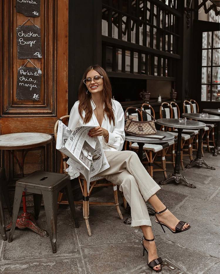 Para equilibrar a silhueta, sempre que vestir umas calças largas de cintura subida, opte pela parte de cima mais justa ao corpo, pois vai dar-lhe um look com mais harmonia.