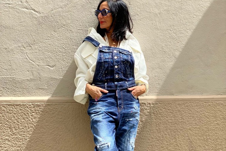 - Num estilo mais irreverente e singular, pode personalizar o visual dando uma nova vida às suas jardineiras, usando-as viradas para baixo e acrescentando acessórios cheios de atitude, como por exemplo, sandálias de salto alto, colocar um fio comprido, carteira XL e óculos de sol com armação de massa.